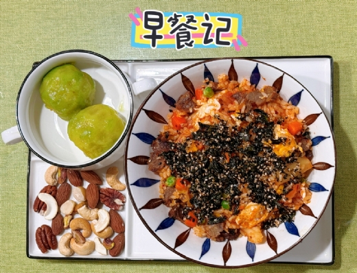 6:00自然醒,6:40摆拍结束,今天的牛排又给我用空气炸锅烤焦成牛肉干了,挫人一个。如实酸奶放了蓝莓和坚果摆拍好看,娃却说下次啥也别放。